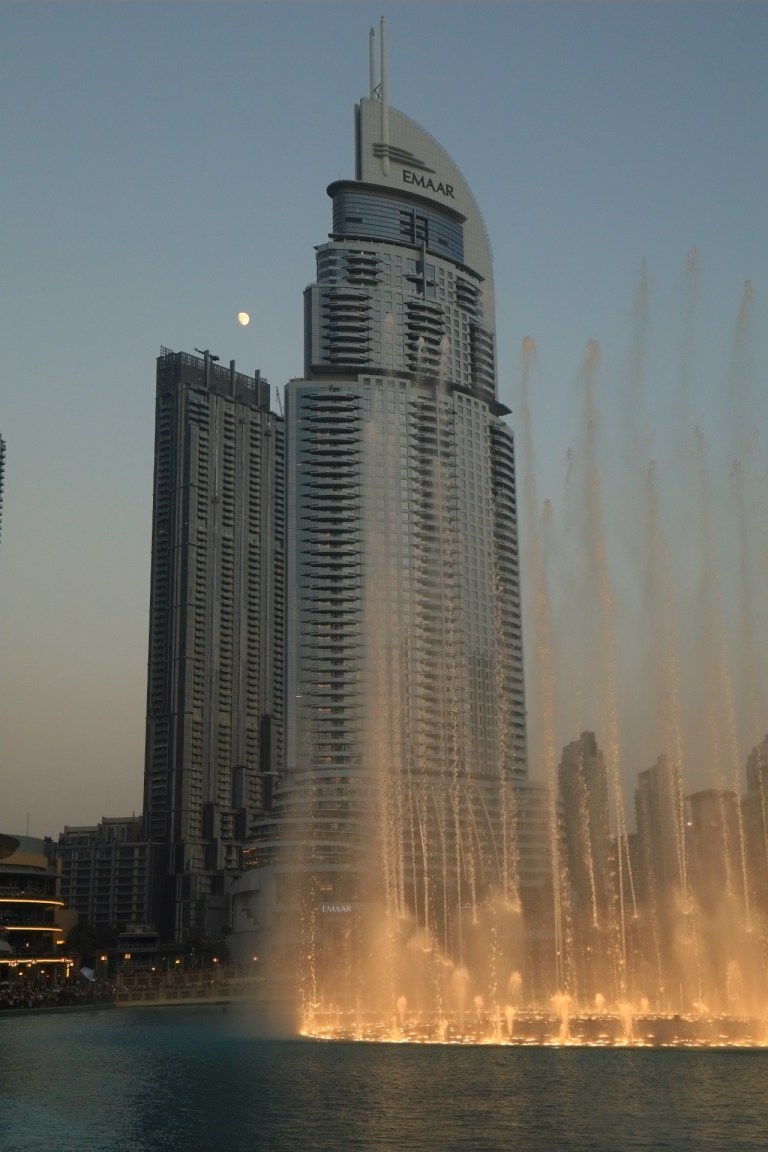 Our last day in Dubai sees us trying to escape the heat again however we do manage to catch the water fountains in the pool in front of the Burj Khalifa building. This building is a monster at nearly 830 metres high. The pool with the fountains is also impressive as is the water spurting display. It’s a great show and we are also lucky enough to have the moon appear from behind the building at the right time.