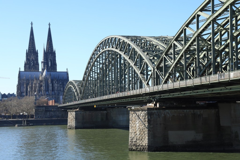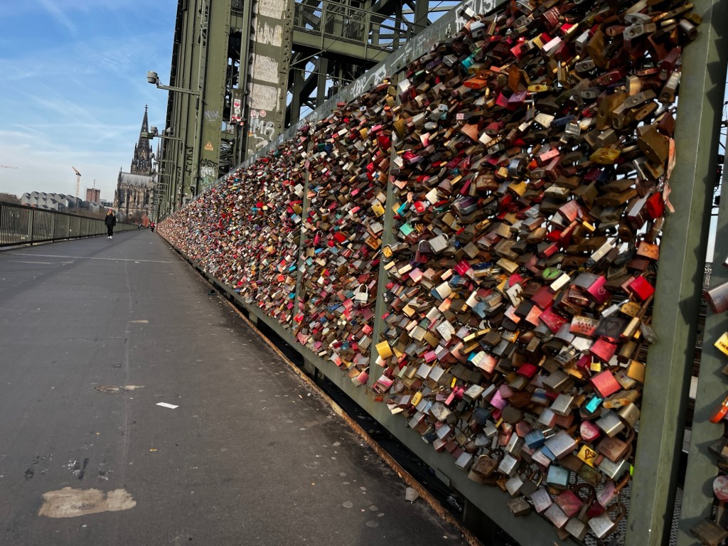 We cross the Aussichtspunkt Hohenzollernbrücke which is the main rail and pedestrian bridge crossing the Rhine River. It’s an iconic bridge that provides the best location for a photograph of the Cologne Cathedral which is a 157m tall gothic style church that is an absolute standout. The other eye catching part of the bridge is its collection of padlocks used by people to show their love. There are literally millions of these locked onto the bridge’s fences and hand rails.