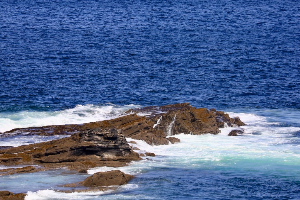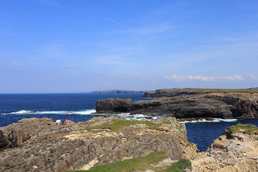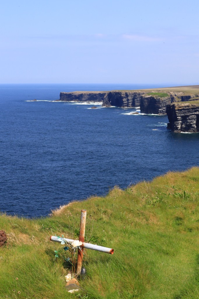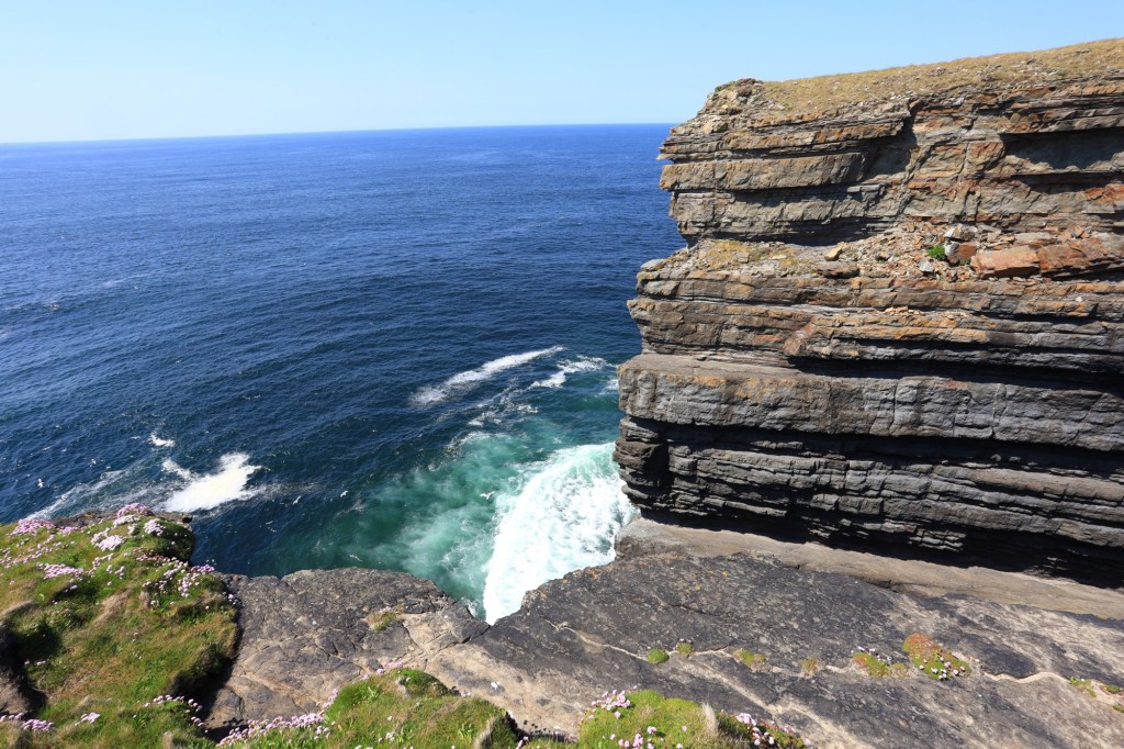 The cliffs are rugged and fall away to the sea in an almost sheer fashion. But the part that amazes me is that you can physically walk right out to the edge of the cliff. No guard rails, no pathways, just grass and rock up to the point that the land disappears. We are talking cliffs that plunge over twenty metres to the sea below. With these being the best weather conditions we bravely step to within a ruler’s length of the edge. Freaking awesome!