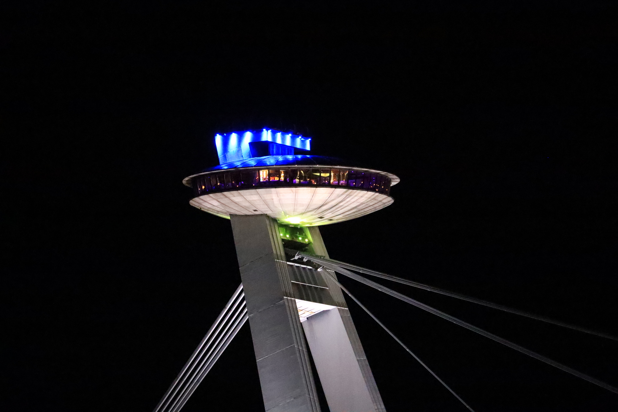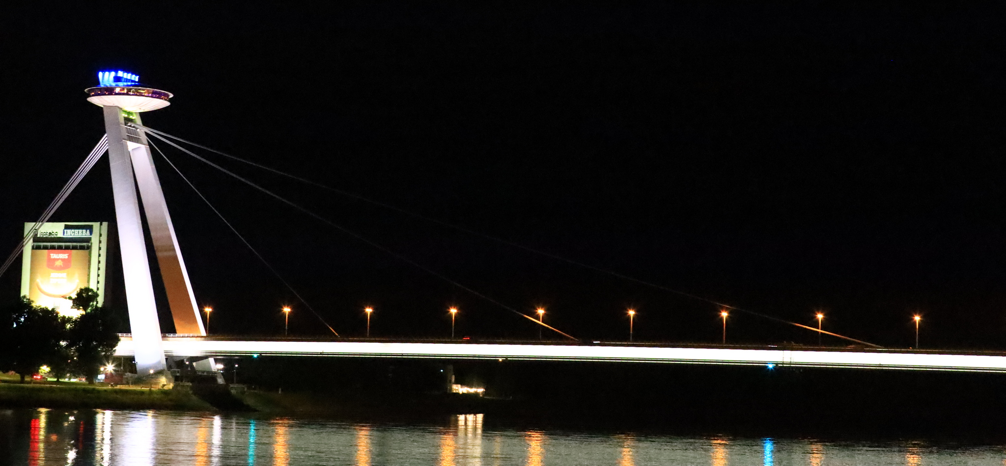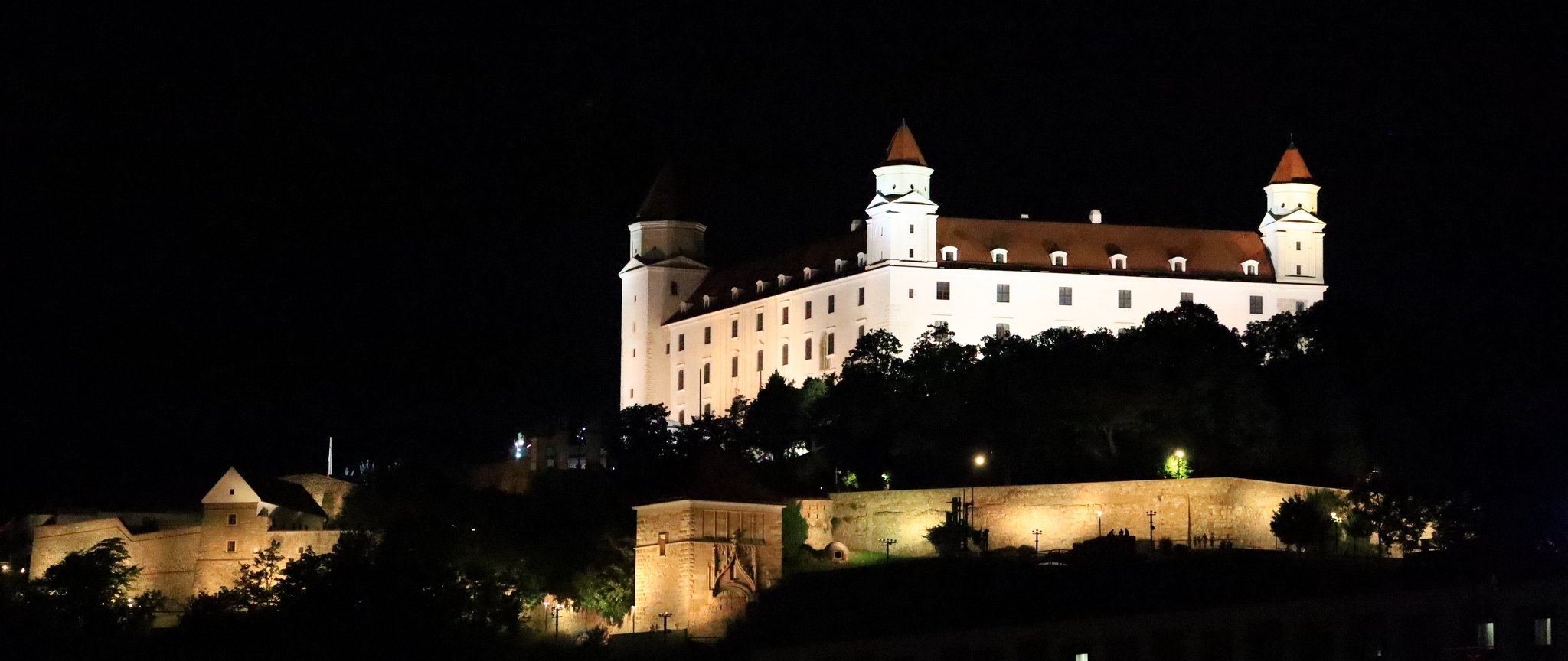 With an afternoon of sightseeing behind us, we head back to the boat and prepare to set sail for the next port, Vienna in Austria. It again starts as an evening departure which provides our last views of the city under lights. There is a particularly interesting bridge across the Danube in Bratislava that looks modern and has a restaurant placed high above the road level. At night it looks like a UFO but it is the walled castle on the opposite bank that steals the show.